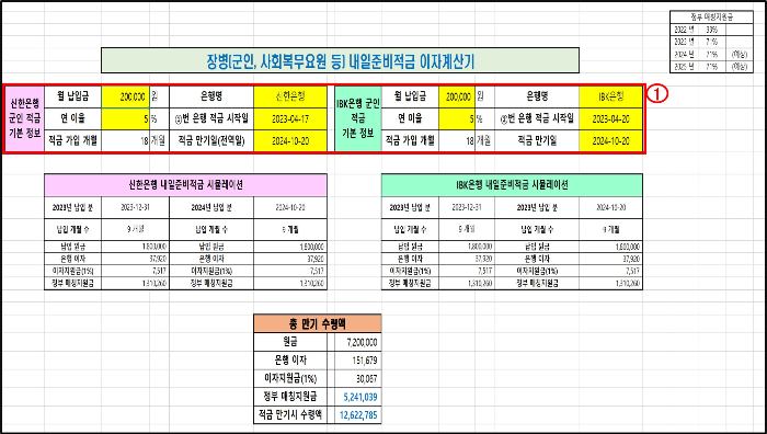 🎈 각 은행별, 연도별 산출이 완료되면 가장 아래 총 만기수령액을 확인하시면 두 은행의 총 합을 확인하실 수 있습니다.