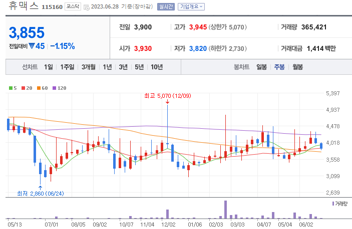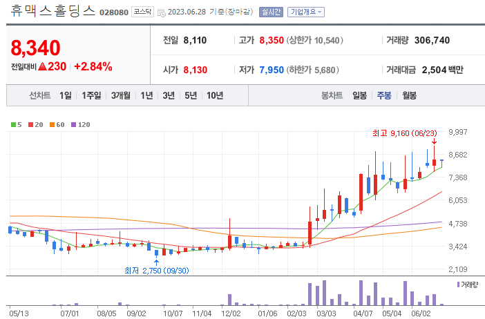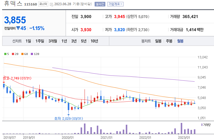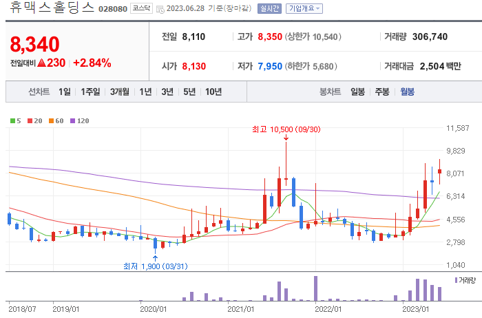 휴맥스홀딜딩스는 120주선의 강력한 저항으로 작년 7월부터 현재까지 돌파를 하지 못하는 상황을 보여주고 있습니다. 월봉 또한 60월선이 저항으로 작용하고 있는데 점차 수렴해가며 돌파를 준비하는 모습입니다. 월봉상 60선을 돌파하여 유지하는 모습을 보여준다면 앞으로 우상향할 가능성 있다고 예상해봅니다.