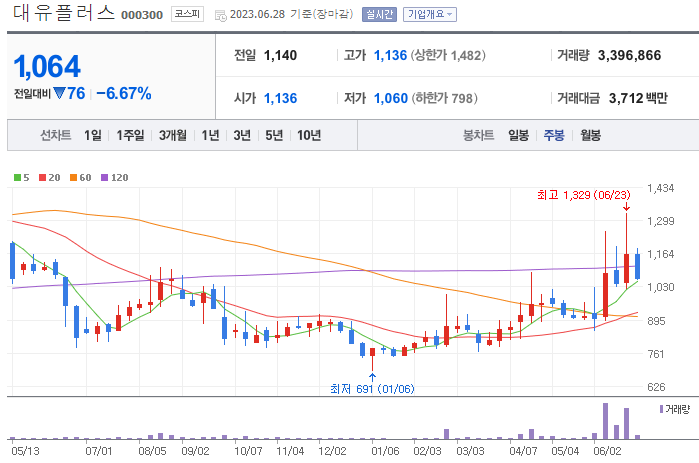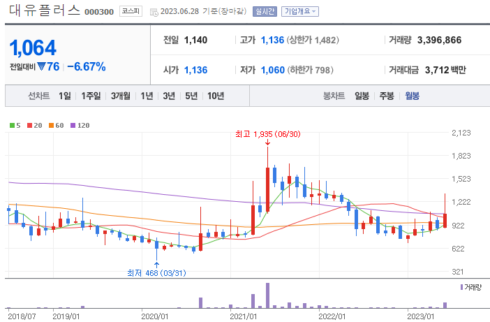 대유플러스의 주봉을 보시면 120주선을 최초로 돌파하는 흐름을 보여주고 있고 월봉에서도 주요 중요라인의 돌파를 시도하는 모습을 보실 수 있습니다. 주봉상 1,030원을 지지하여 준다면 우상향할 수 있다고 예상해볼 수 있는데 회사의 재무상태가 그닥 좋다고 할 수 없어 대유플러스는 PASS 또는 소액으로 접근해 보는 것이 어떤지 생각이 됩니다.
