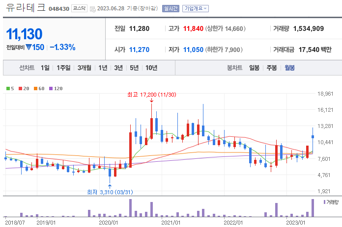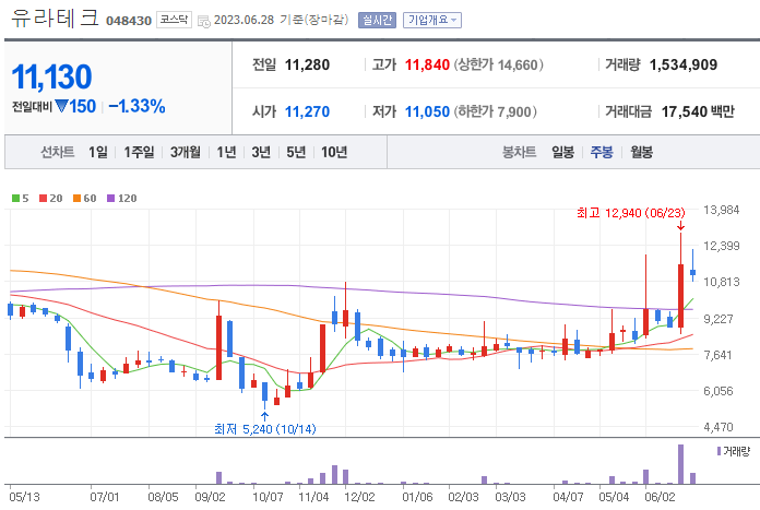 유라테크의 주봉상 지난주 10,430원대의 중요 라인을 돌파하는 흐름을 보여주고 이번 주 눌림목이 나오고 있는 상황입니다. 월봉상으로도 큰 흐름상 중요라인을 돌파하는 등 의미있는 모습을 보여주고 있습니다. 매출도 전년 동기 대비 증가하였고, 부채비율이 낮아 재무건정성도 좋아보입니다. 재료가 지속된다면 조금 더 상승할 것으로 예상이 됩니다.