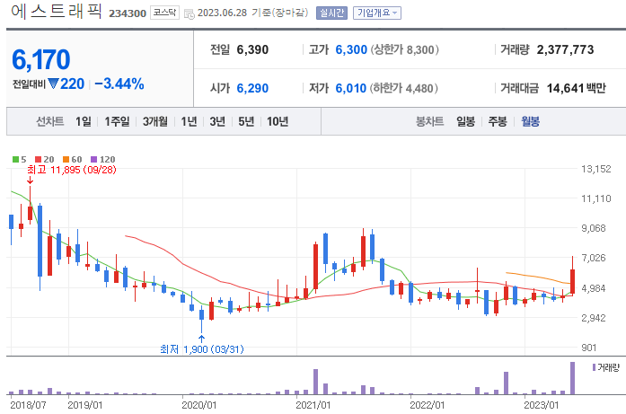 에스트래픽은 큰 흐름상 아주 좋은 흐름을 보여주고 있는 것으로 보입니다. 주봉에서도 주요 라인은 돌파하는 모습과 눌림목 후 재상승하는 모습이 인상적입니다. 또한, 월봉에서도 2021년말 20월선을 하향돌파한 후 약 1년 6개월만에 상향돌파하는 모습이 우상향을 할 수 있지 않을까 조심스럽게 예측할 수 있는 대목입니다. 월봉상 9,000원 부근까지 상승할 수 있는 여럭이 충분해 보입니다.